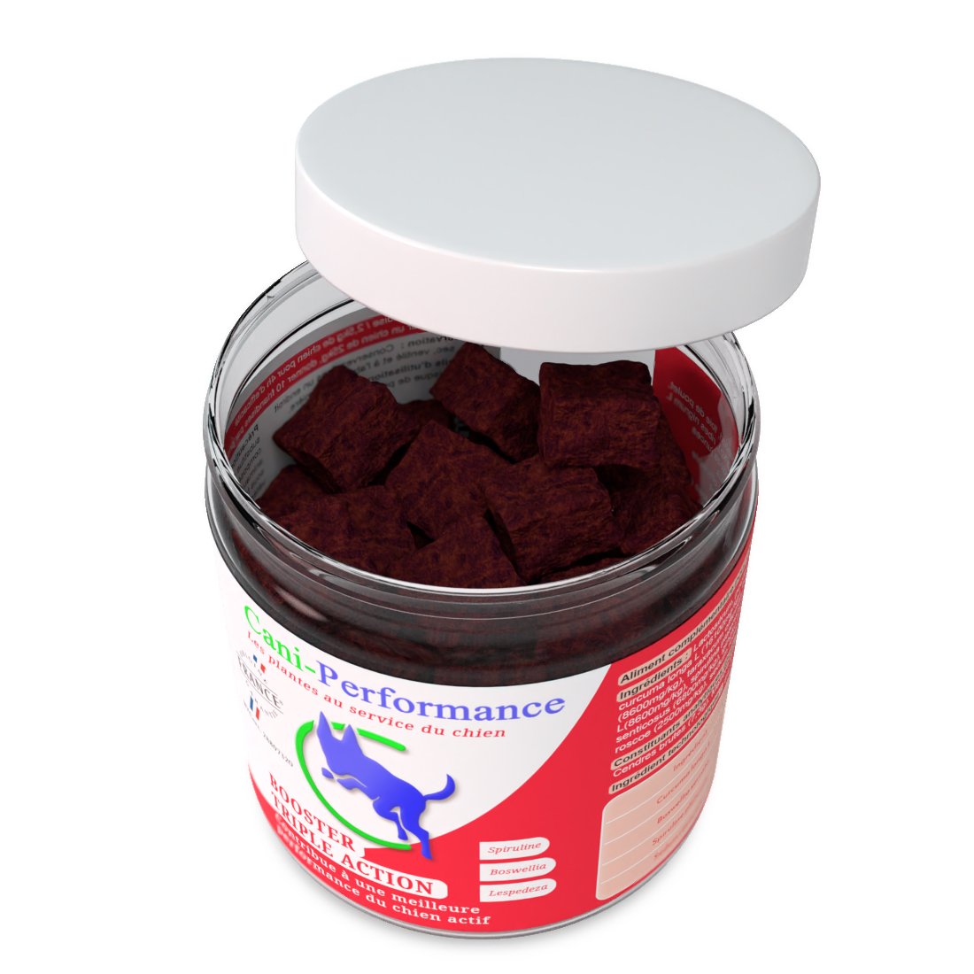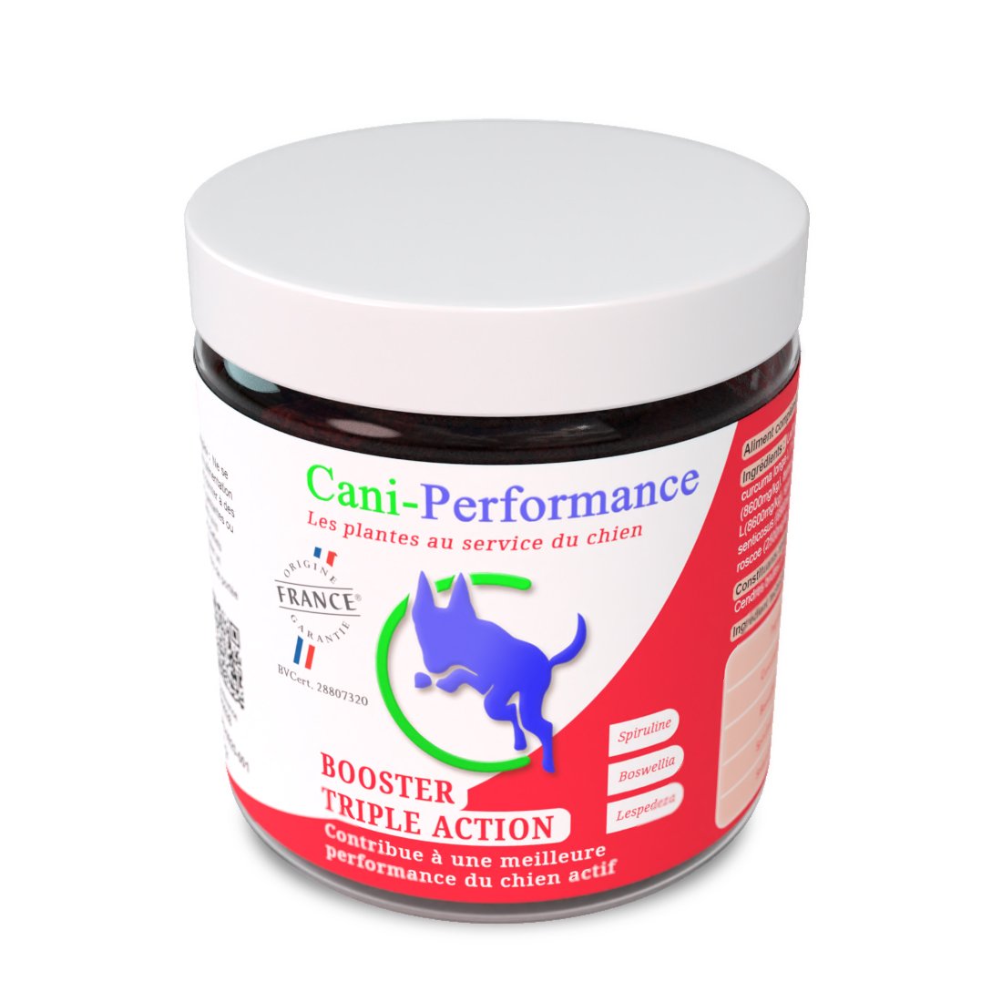Le Booster Triple Action est un complément alimentaire innovant sous forme de biscuit appétent, conçu pour optimiser la performance sportive globale des chiens pratiquant le sport, la chasse ou le travail. Sa formule complète associe plusieurs plantes dont quatre reconnues pour leurs effets bénéfiques sur l’activité physique :