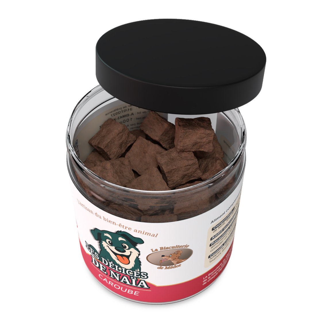 Offrez à votre chien une friandise à la fois gourmande et originale avec Les Délices de Naïa à la caroube, une recette sans céréales qui marie la saveur intense du foie de poulet à la douceur naturelle de la caroube, une légumineuse méditerranéenne souvent comparée au cacao pour ses arômes chocolatés, mais sans théobromine, donc parfaitement adaptée aux chiens.