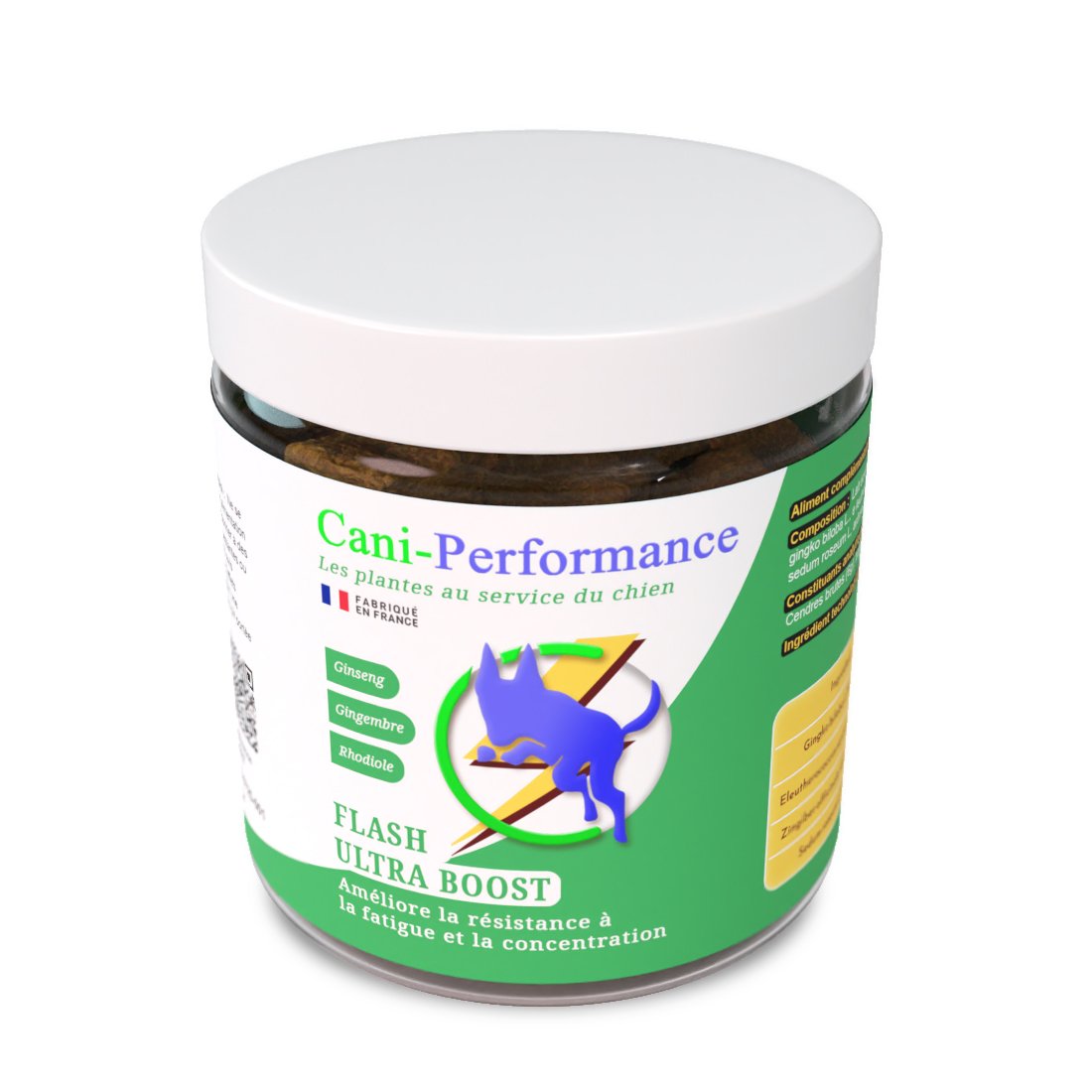 Le Flash Ultra Boost est un complément alimentaire sous forme de biscuit appétent, spécialement conçu pour offrir un coup de fouet immédiat aux chiens sportifs, de travail ou de compétition. Il soutient le dynamisme, la réactivité et la motivation pendant l’effort ou avant une épreuve intense. Sa formule associe des ingrédients naturels sélectionnés pour leur efficacité et leur action rapide :