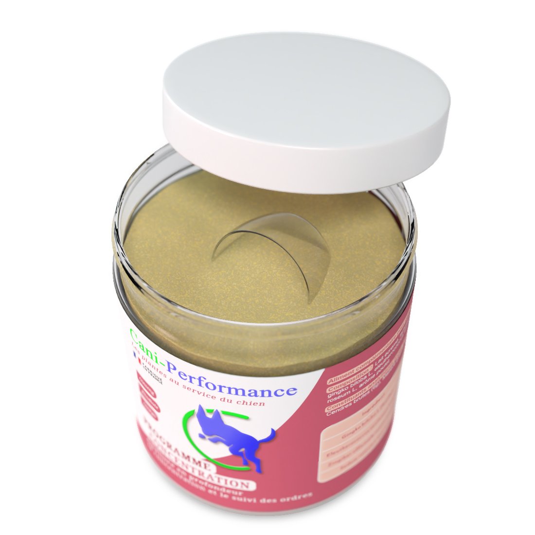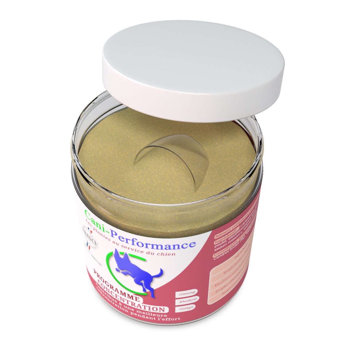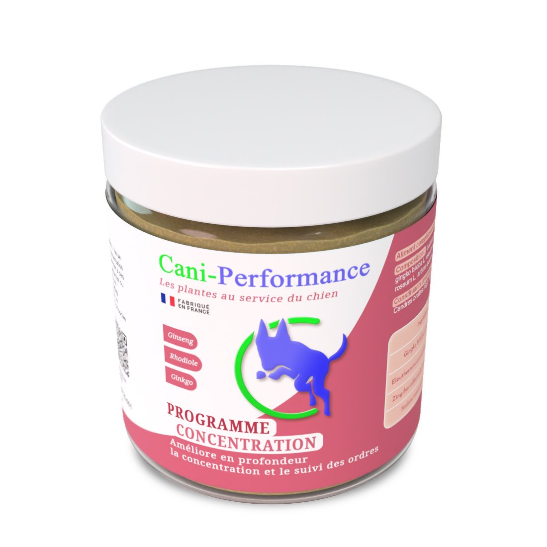Le Programme Concentration est un complément alimentaire en poudre, conçu pour accompagner les chiens sportifs, de travail ou de compétition dans les situations demandant calme, concentration et réactivité. Il aide l’animal à rester attentif tout en favorisant un comportement posé et équilibré. Sa formule associe des ingrédients naturels soigneusement sélectionnés :