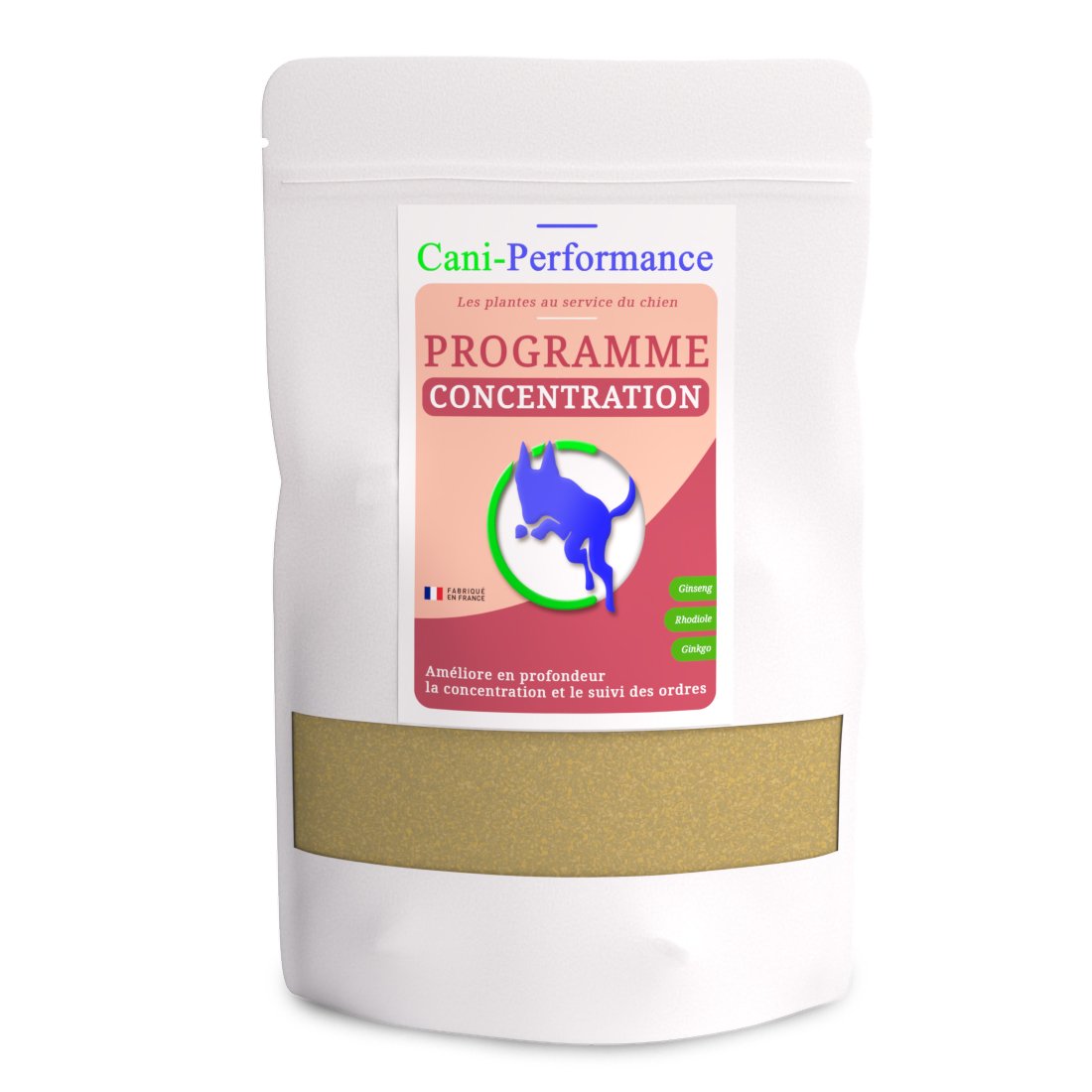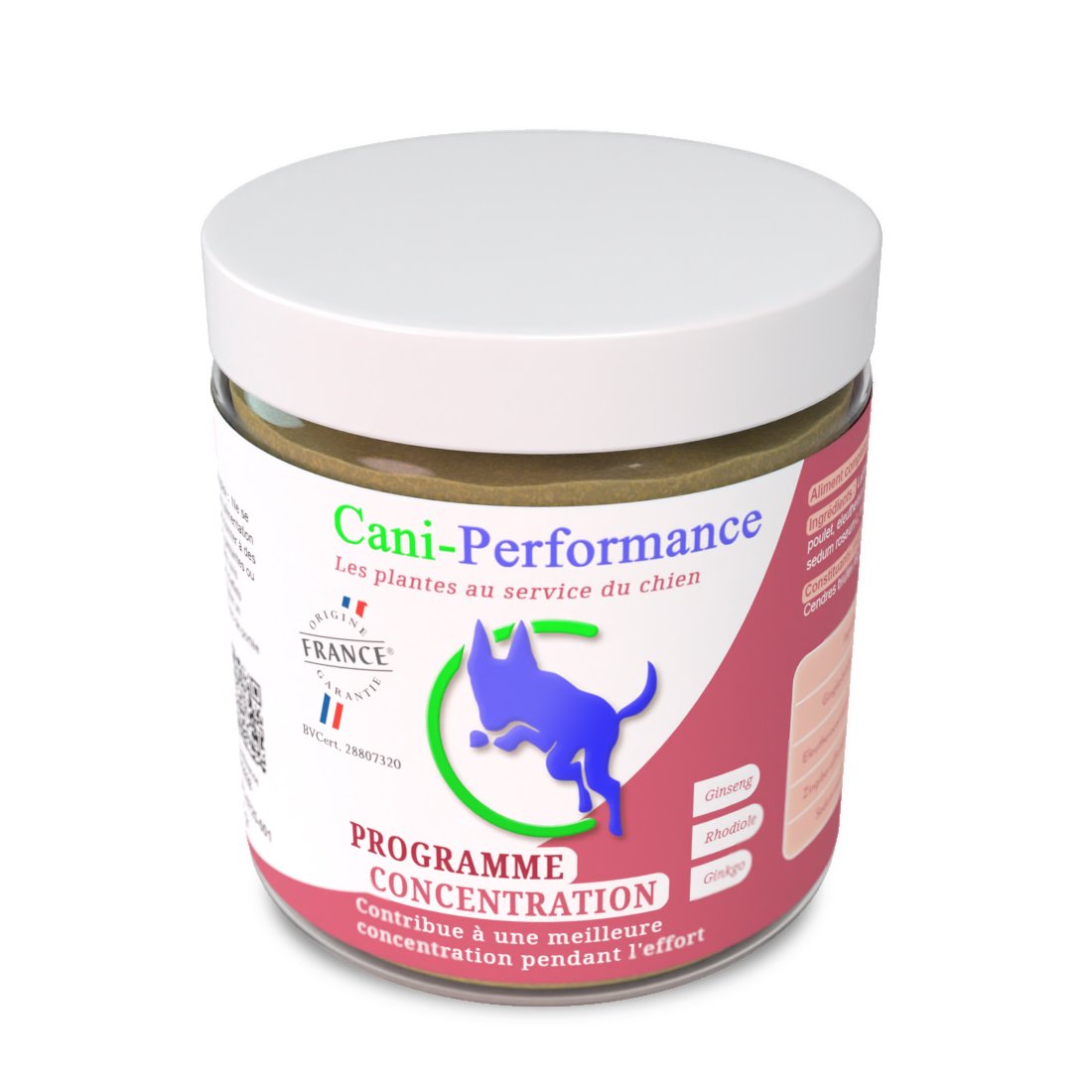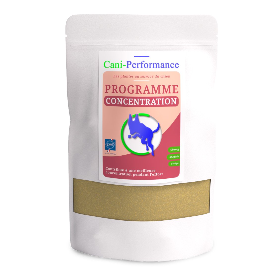 Conçu pour un usage régulier lors des périodes d’entraînement, de compétition ou d’apprentissage, le Programme Concentration aide le chien à rester concentré et stable. Les effets positifs se maintiennent uniquement tant que le produit est administré régulièrement et peuvent diminuer en cas d’arrêt.